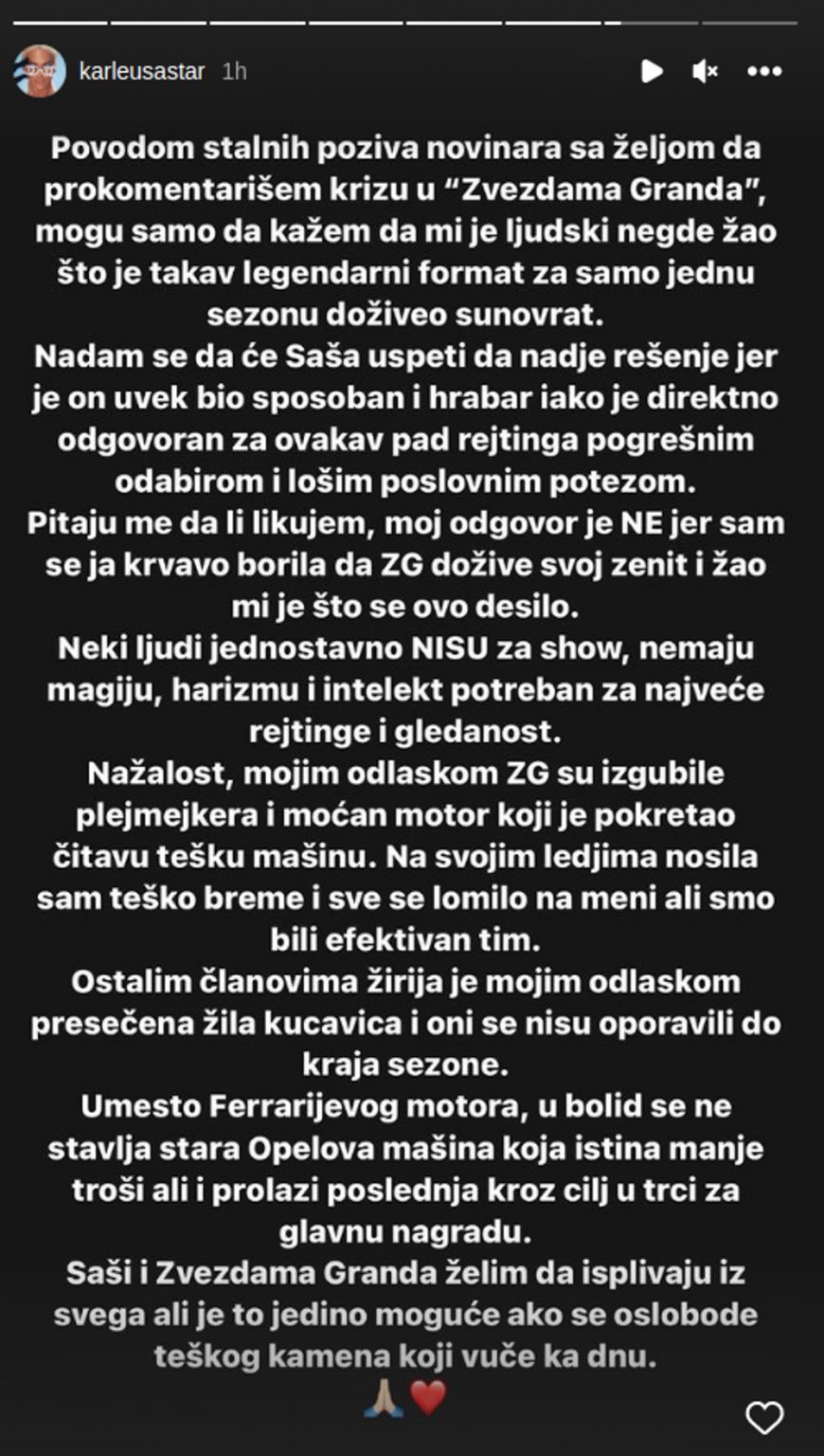 – Povodom stalnih poziva novinara za željom da prokomentarišem krizu u “Zvezdama Granda”, mogu samo da kažem da mi je ljudski negde žao što je takav legendarni format za samo jednu sezonu doživeo sunovrat. Nadam se da će Saša uspeti da nađe rešenje jer je on uvek bio sposoban i hrabar iako je direktno odgovoran za ovakav pad rejtinga pogrešnim odabirom i lošim poslovnim potezom. Pitaju me da li likujem, moj odgovor je NE jer sam se ja krvavo borila da ZG dožive svoj zenit i žao mi je što se ovo desilo – napisala je Karleuša i dodala…