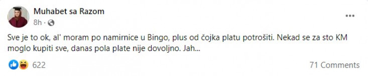 – Sve je to ok, al’ moram po namirnice u Bingo, plus od čoj’ka platu potrošiti. Nekad se za sto KM moglo kupiti sve, danas pola plate nije dovoljno. Jah… – napisala je popularna Raza.