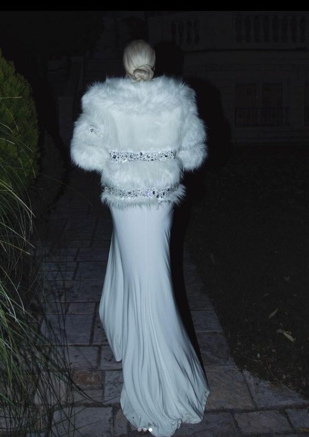 Bijela suknja, bijele, visoke potpetice, bijela bunda optočena svarovskim kristalima, a ispod koje nije imala ništa.