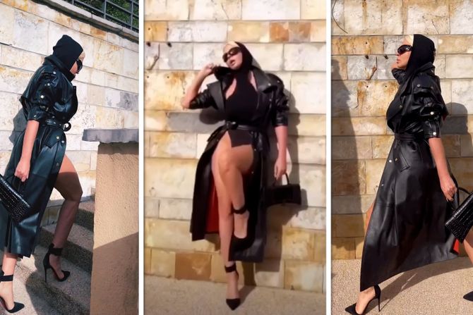 Pevačica je obukla crni bodi, koji je veoma neobičnog kroja, kao i crni kožni mantil, a sve to uparila je sa crnim štiklama.